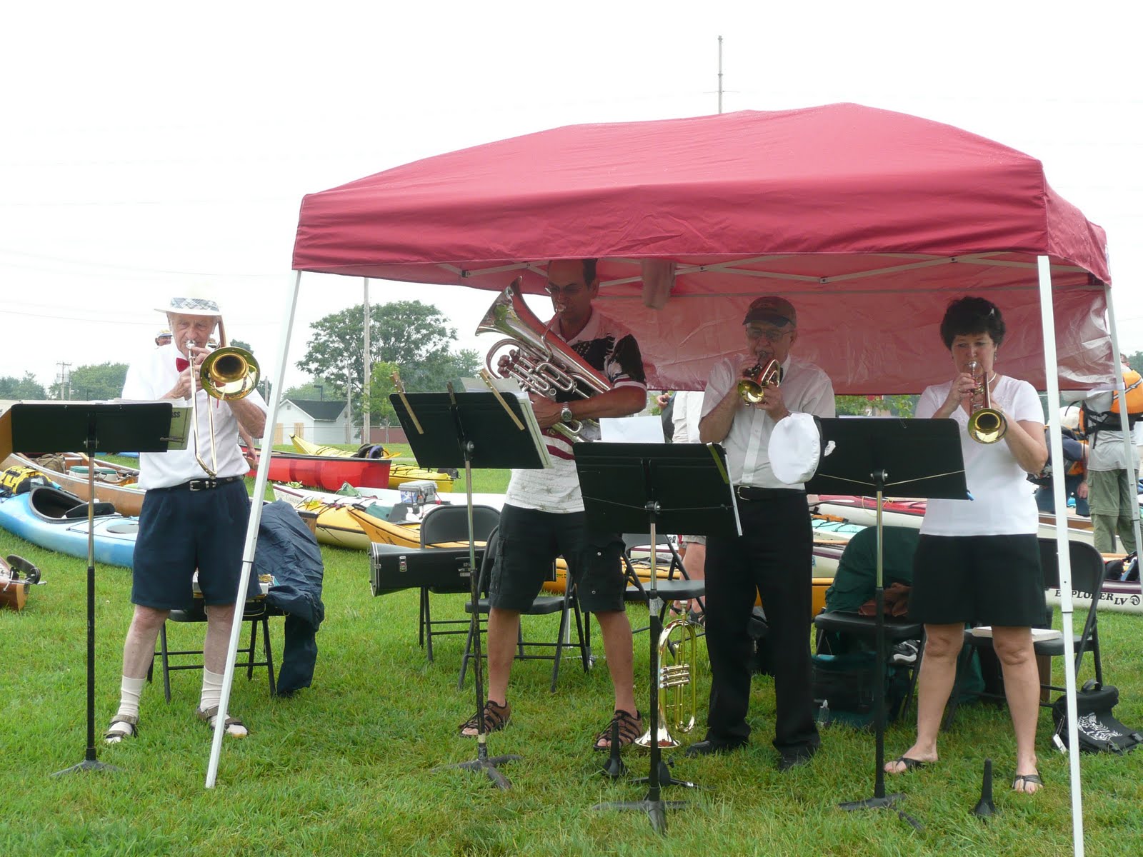 When we got to Clinton there was a brass band playing at the landing--very cool! Bill was on the ramp helping people out with their boats (as he does every day), and we walked up the hill to the camping area. I dried out the tent and ground cloth, set up the tent, and then took all our smelly wet laundry to the marina laundromat. Bill and I skipped the group outing to a mexican restaurant and instead had a quiet dinner at a family restaurant. When we got back we said goodbye to a new friend and new Rumbler, Ralph, who has to leave the trip early.